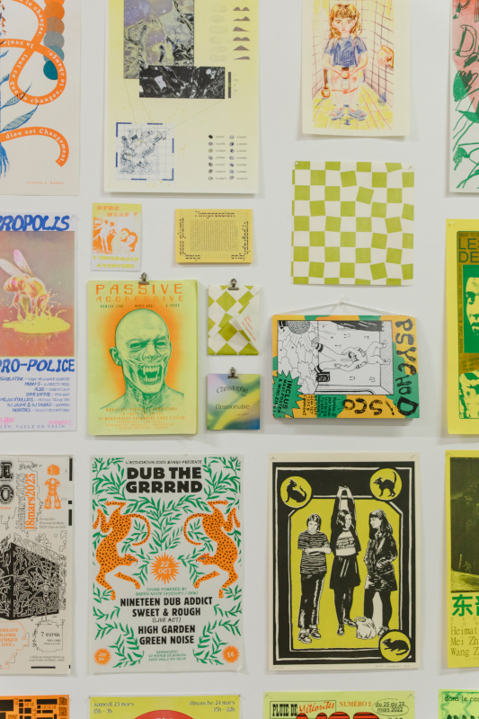 Depuis presque dix ans, des ateliers d’impression se sont installés dans les locaux de GZ imprimant tout un tas d’objets: affiche, tract, carte postale, carte de visite, livre, marque page, t-shirt, brochure, livre de recettes... Différentes techniques s’y sont retrouvées au fil des années, tel que la sérigraphie avec au départ Société écran, puis aujourd’hui la Chérigraphie, l’impression typographique avec Peso Pluma, la risographie avec Toner Toner, le façonnage avec Sans Contre Façon et l’archivage avec Brrrazero. Sortis des cartons, ces archives constituent ici un petit fragment, une bribe, un résidu, un échantillon, une petite peau de lait, de ce qui a pu s’éditer ici, faire vivre et teinter le paysage souterrain lyonnais.