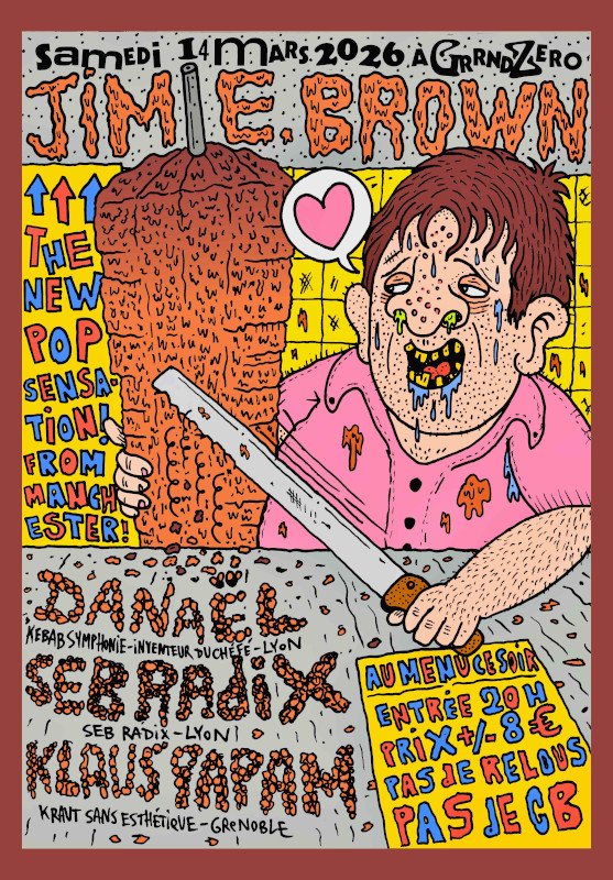 Jim E. Brown, nouvelle sensation pop de Manchester, coincé éternellement à 19 ans, guinness punk aux tubes tantôt cold, tantôt lo-fi, toujours cynique, artiste ultra prolifique, passionné par les mets les plus gras et les bières les plus lourdes, il revient un an après son passage à lyon, qui avait retourné le bar des Capus et vider tous ses fûts.