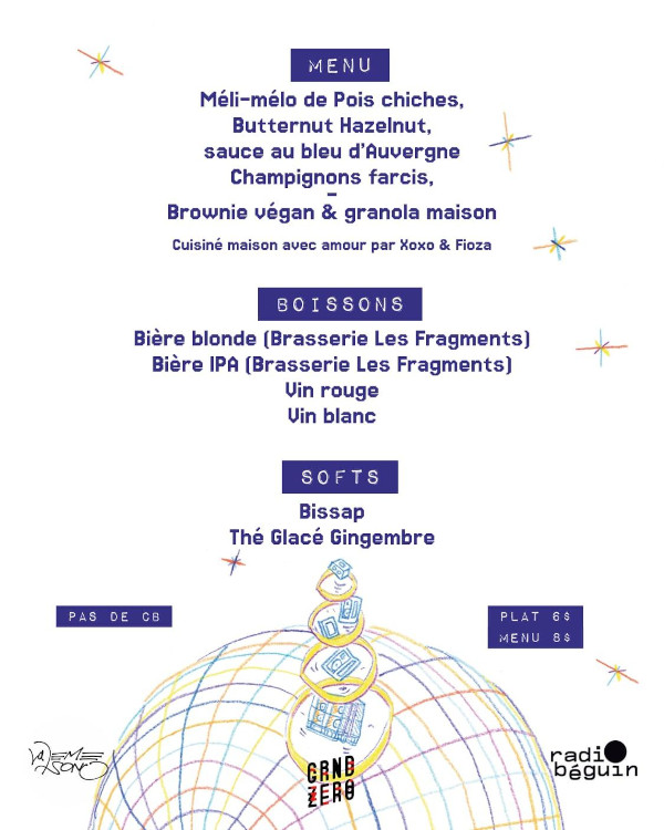Menu à petit prix, dj set de 15h à 21h, coin chill et atelier de création de masques pour les enfants animé par l’artiste 1PORT.